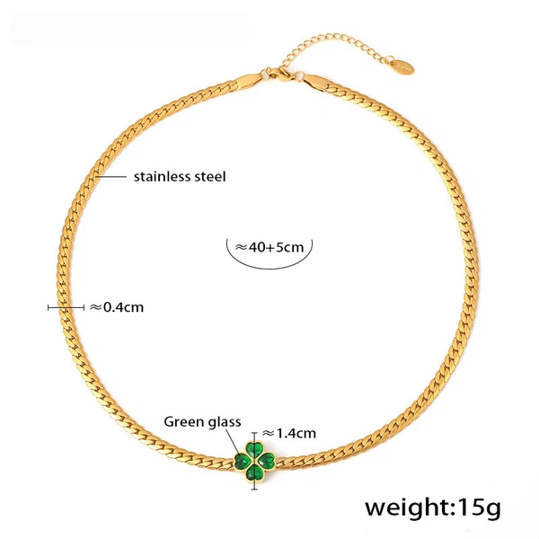 Ogrlica s lančićem od zelene staklene djeteline izrađena je od nehrđajućeg čelika 316L. Izdržljiv je i vodootporan, otporan na koroziju, ogrebotine.